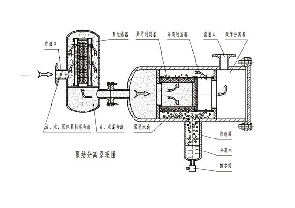 聚結(jié)系統(tǒng)由一組聚結(jié)濾芯組成,聚結(jié)濾芯采用了獨特的極性分子結(jié)構(gòu),油液中的游離水及乳化水在通過濾芯后,被聚結(jié)成較大的水滴,再依靠重力的作用下沉降至儲水罐內(nèi)。